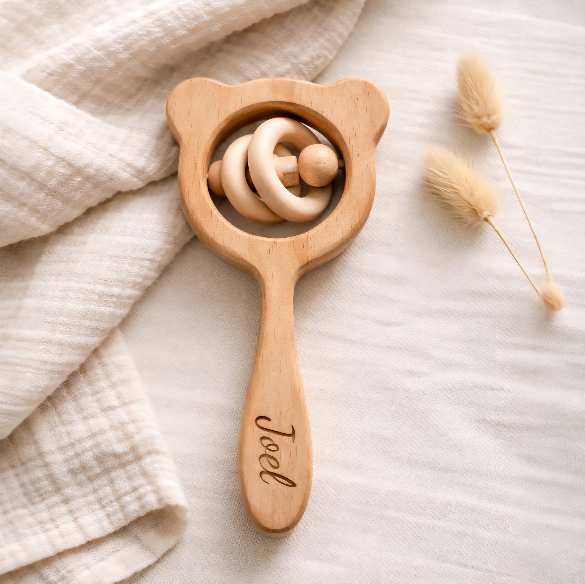 Unsere Greifrassel in Bärenform vereint modernes, skandinavisches Design mit der Wärme von natürlichem Holz. Die integrierten Holzringe sorgen für sanfte Akustikreize und fördern spielerisch die Motorik deines Babys. Ein zeitloses Accessoire, das durch die Personalisierung zum perfekten Geschenk zur Geburt oder Taufe wird. 🧸