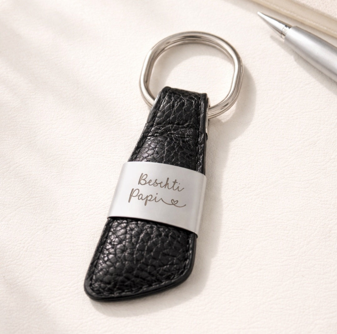 Dieser elegante Schlüsselanhänger vereint zeitloses Design mit persönlicher Note. Gefertigt aus hochwertigem, fein genarbtem Leder und ergänzt durch einen stabilen Metallring, ist er der perfekte Begleiter für Alltag, Büro oder Auto. Die glatte Metallfläche lässt sich individuell gravieren – mit einem Namen, einem besonderen Datum oder einer kurzen Botschaft.