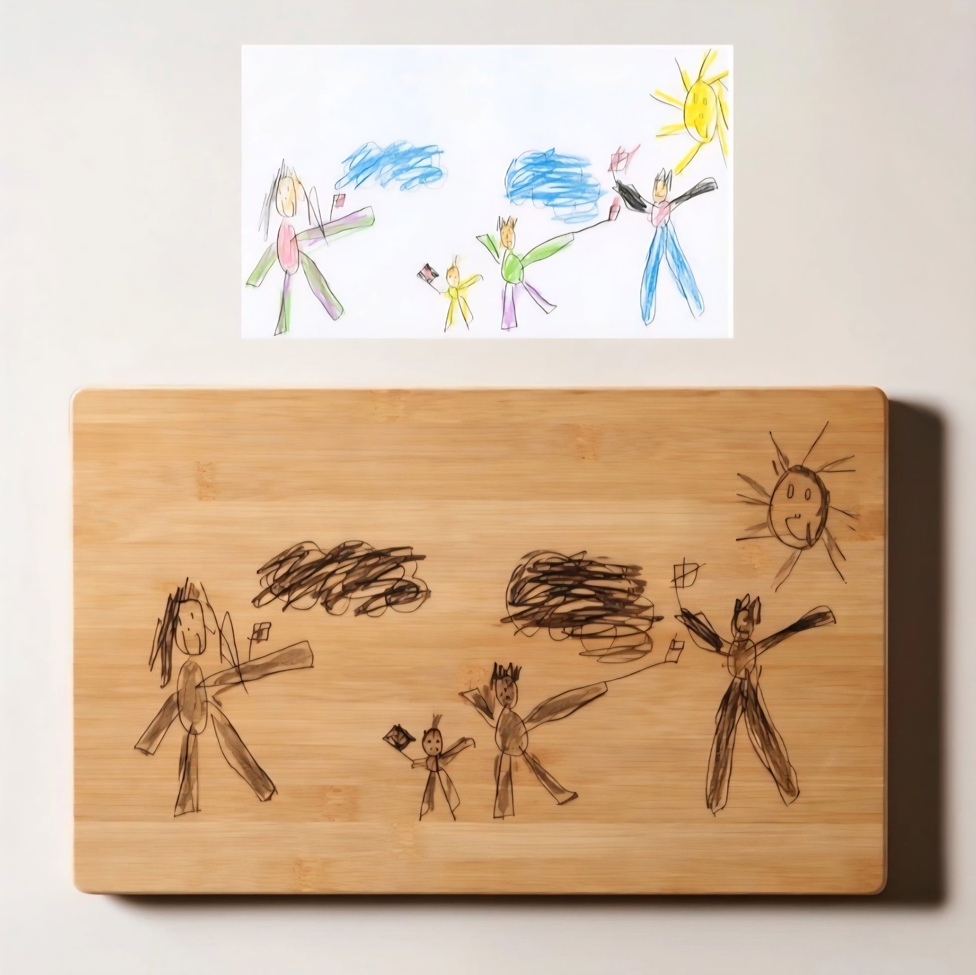 Das Beste daran: Sie werden selbst zum Designer! 🎨🔨 Wir personalisieren Ihr Brettchen ganz nach Ihren Wünschen. Ein besonderes Highlight: Sie können uns sogar eine eigene Kinderzeichnung hochladen! Wir übertragen das kleine Kunstwerk originalgetreu per Gravur auf das Holz. So wird aus dem ersten Gekritzel oder dem Familienporträt ein Geschenk, das garantiert Tränen der Freude auslöst. 🤍