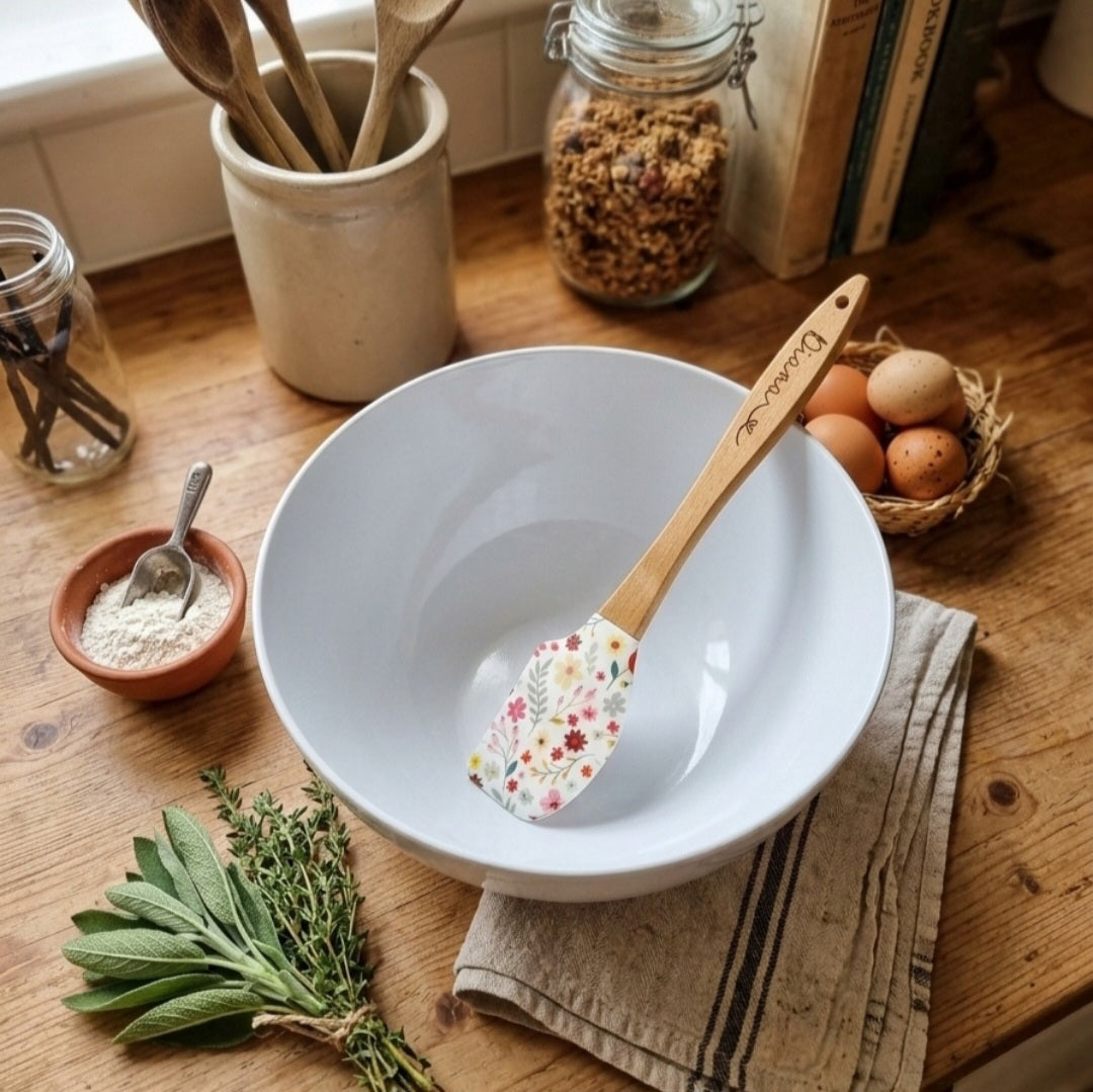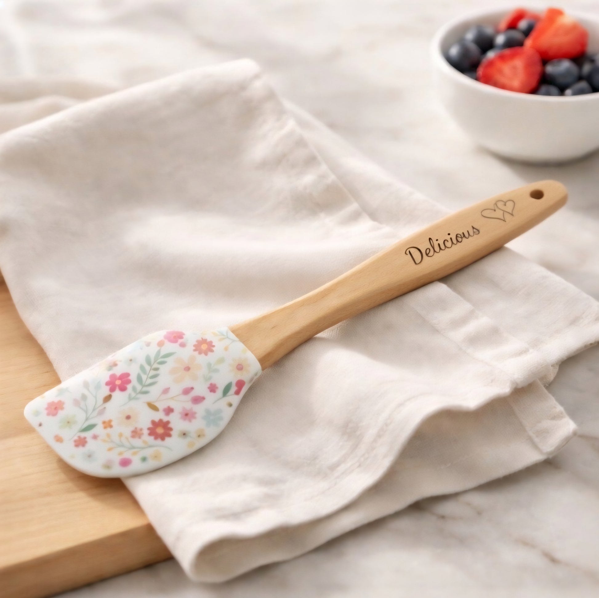 Verleihen Sie Ihrer Küche eine Prise Frühlingszauber! Unser hochwertiger Silikon-Teigschaber mit edlem Holzgriff ist nicht nur ein praktischer Helfer beim Backen, sondern ein echtes Unikat. Das zarte Blumenmuster sorgt sofort für gute Laune, während die individuelle Gravur am Griff das Utensil zu einem ganz besonderen Geschenk macht.